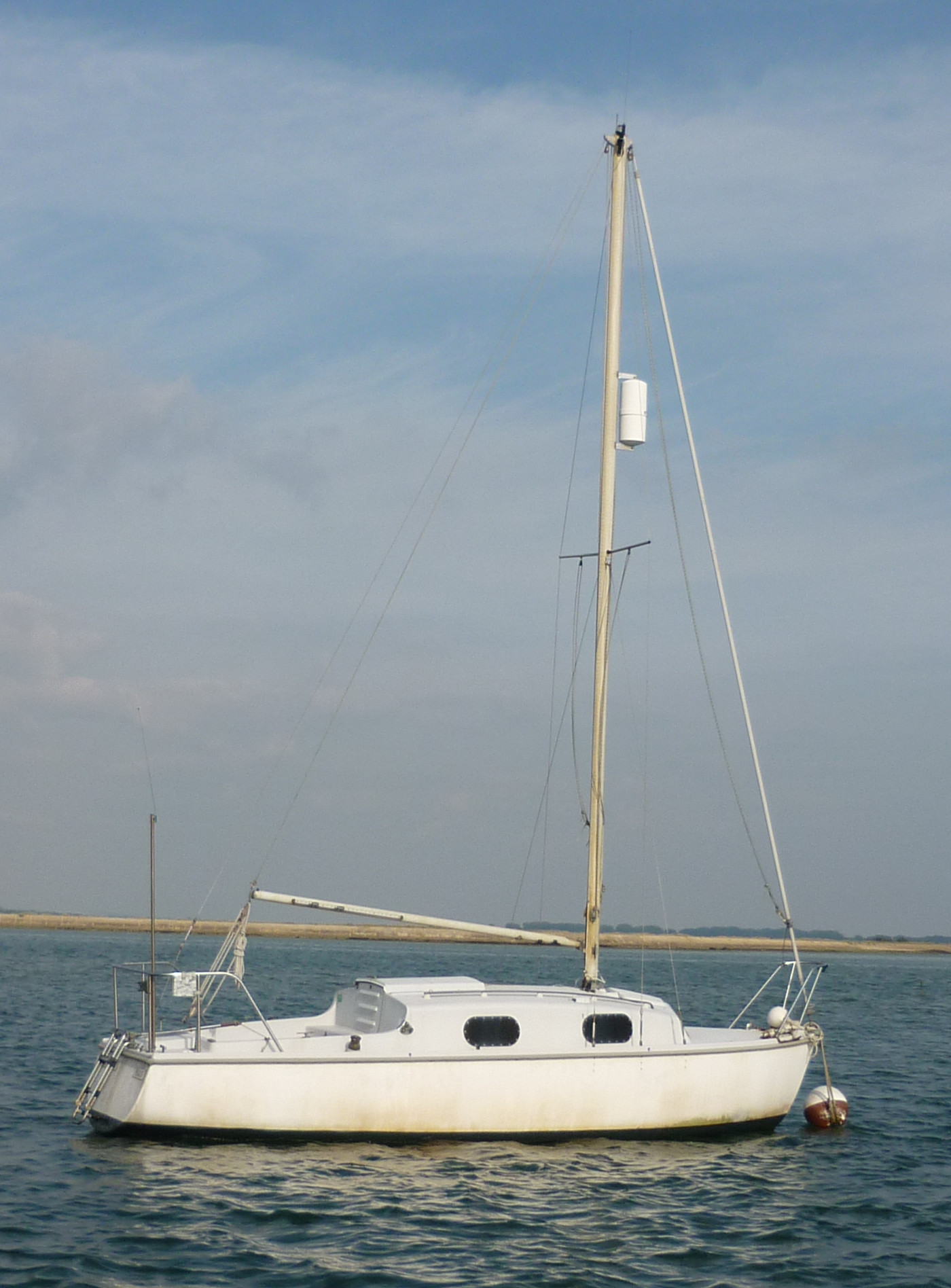 A closer cropped photo of Kingfisher 20+ Happy Mouse on her mooring in Langstone Harbour.